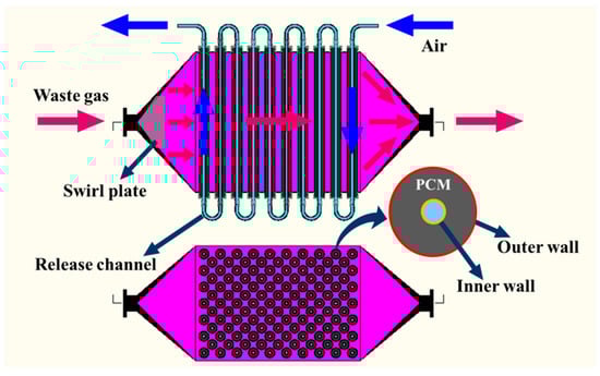 (2) Cascaded PCM storage unit: transferring gas heat to a tube-type PCM exchanger via convection is an effective approach applied in latent storage systems [27,28,31,32,33]. Good transfer performance can be achieved considering both the compactness factor and the thermal resistance in this configuration. Referring to Figure 4, a dual-channel module based on the structure of the double tube exchanger was designed to separate the channels of charging and discharging in order to obtain a clean HTF for residential usage. Composite PCMs were synthesized using carbonate and nitrate and equipped in the space between the inner and outer wall of the tubes to form HTM and LTM, respectively. The main physical properties of the PCMs are shown in Table 2. A swirl plate was installed at the waste gas inlet of the module to produce a uniform flow for heat transfer. When the flue gas entered the module, the convection heat transfer was dominant between the gas and outer wall of the steel tubes, which were arranged in a staggered manner. Then, the heat was transmitted to the PCMs by conduction. The release channel was located in the center of the tube and the stored thermal energy could be discharged by the heat transfer between the ambient air and the inner wall of the tubes. The released thermal energy was used to heat water to 315 K by the air–water heat exchanger, the efficiency of which could reach 98.5%. The pipes for the HTF transmission and the outer casings of the modules were insulated to reduce heat loss to the surroundings.