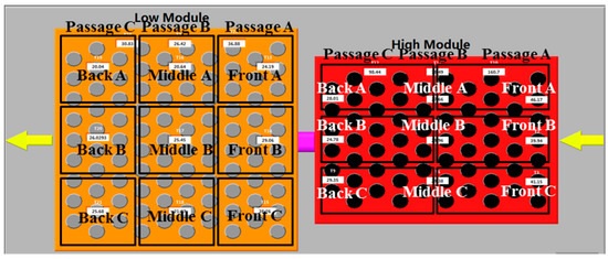 To simplify the evaluation of the storage status of the modules, referring to Figure 5, the HTM and LTM were divided into six and nine parts, respectively. The overall condition of the modules was described using the energy and exergy stored in the measured tubes, which were