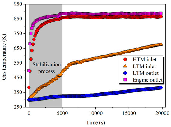 As shown in Figure 7, compared with the instantaneous change of power output to the steady state, the temperature of the flue gas at the engine outlet experienced a stabilization process (0–5000 s). After that, the gas temperature difference between the engine outlet and HTM inlet remained at approximately 30 K due to the heat loss during the gas transmission. On the other hand, the outlet gas temperature of HTM and LTM increased gradually with the charging procedure.