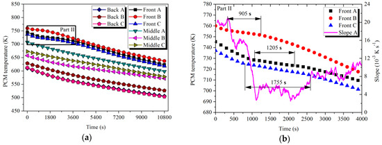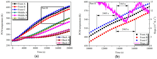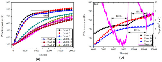 Temperature variation of PCMs with time in LTM during the charging process: (a) PCM temperature; (b) Part II.