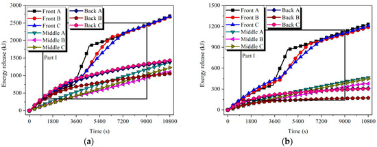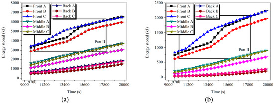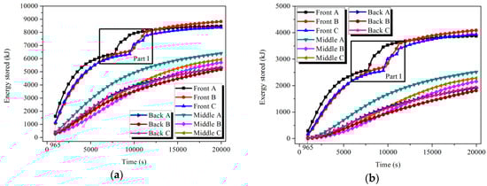 Based on Equations (6) and (9), the uniform temperature distribution in each tube could be achieved when t = 965 s for HTM and t = 9700 s for LTM, respectively. The energy and exergy stored in the nine tubes of each module could be calculated by Equations (7) and (8), and the results are shown in Figure 10 and Figure 11. During the melting processes shown in Parts I and II, the storage capacity of the tube improved significantly. For the Front tube A in the HTM, 17% and 22.6% of the total stored energy and exergy, respectively, in the charging process were achieved during the latent process, which only occupied 8.2% of the charging time.