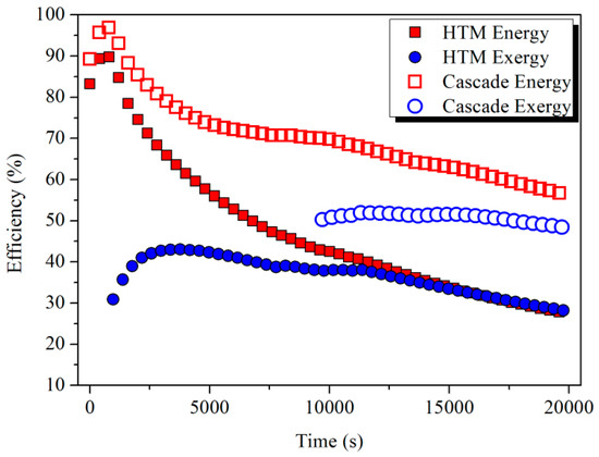 After 19,800 s (5.5 h), the energy stored in the HTM and LTM was 802.5 and 840.5 MJ and the exergy was 325.9 and 233.6 MJ, respectively. About 56.4% energy and 48.4% exergy of the input flue gas could be stored. It is worth noting that more energy but less exergy was stored in the LTM than in the HTM due to the quality difference of thermal energy. The storage efficiency calculated by Equation (11) is shown in Figure 12. The results indicated that, compared with the single HTM scenario, two-stage cascade thermal storage could effectively increase the storage efficiency. During the time period from 11,000 to 19,800 s when the melting process occurred in both modules, the average energy storage efficiency increased from 33.6% to 62.3%, and the average exergy efficiency also rose from 33.1% to 50.8%.