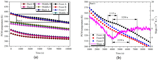 The temperature curves of the PCMs with respect to time at the measurement points are shown in Figure 8 and Figure 9. Referring to Parts I and II, a decrease in the curve slope existed in the latent process because a large portion of heat was absorbed by the solid–liquid phase change. After a fluctuation within a range in the melting process, the curve slope rapidly rose due to the absence of the phase change enthalpy in the liquid state. The slope value at the end point of fluctuation was used to represent the start and end slope of melting to approximately define the time length of the latent process for each tube: