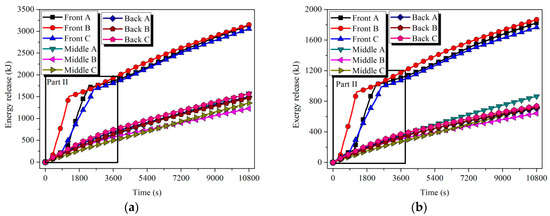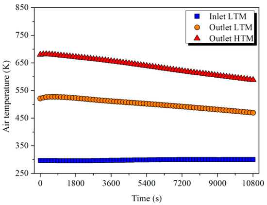 As shown in Figure 17, the ambient air was heated up to an average temperature of 500 and 640 K in sequence after absorbing the heat in the LTM and HTM. The energy and exergy absorbed by the air determined by Equation (14) are shown in Figure 18. After a 3 h release process, 413.6 and 295.4 MJ of energy and 97.5 and 128.4 MJ of exergy were released from LTM and HTM, respectively. Although LTM output more energy, the HTM could supply more exergy to the user because of the higher-temperature-level heat it had stored. The release efficiency of the storage unit defined by Equation (15) was calculated and is shown in Table 5.