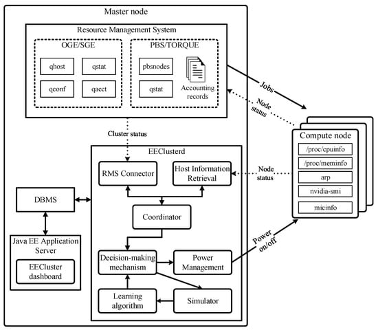 The architecture of this solution is depicted in Figure 2. Its main component is the daemon eeclusterd deployed on the master node of the cluster, which keeps an updated record of the cluster status, its resources and its workload, and then runs a decision-making mechanism that issues power-on/off commands to the compute nodes through a power interface. A learning algorithm and simulator are provided to tune the behaviour of the solution in accordance to the preferences of the cluster administrator. In addition, a web-based administration dashboard allows the administrator to access the information on the cluster status, resources, job records, etc. retrieved by the daemon, as well as manually reconfiguring compute nodes and choosing the parameters that rule the decision-making mechanism. A detailed description of the architecture of EECluster and its modules can be found in Reference [22].