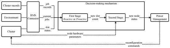As can be noted, the key element in the solution is the decision-making mechanism, which is responsible for automatically optimising the compute resources in accordance to the cluster status while strictly complying with the administrator preferences. This element works in two stages that produce two consecutive decisions in order to reconfigure the cluster. The first stage is hardware-agnostic, relying on a purely logical view of the cluster slots, since its goal is to determine the minimum number of slots that are required to keep on in order to maximise overall saving while meeting the QoS penalty constraints allowed by the cluster administrator. The second stage is the one that translates the number of slots determined by the previous stage into a series of specific compute nodes to be powered on or off. This is done by taking into account the key characteristics of the underlying hardware that drives the economic costs and environmental impacts defined in Section 2 in order to optimise the overall eco-efficiency of the cluster. In other words, the first stage logically optimises the resource allocation to appropriately meet the demand while the second stage explicitly optimises the eco-efficiency of the hardware resources in the cluster. The following sections explain in greater detail how these stages are implemented.