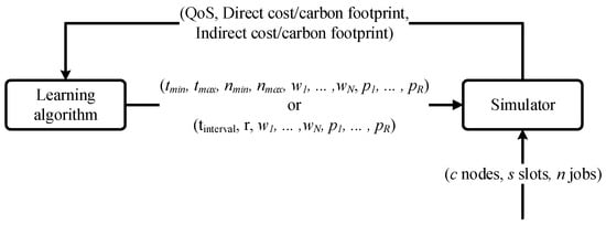In particular, learning is done using the Non-Sorting Genetic Algorithm II (NSGA-II) [55] in a distal supervised learning approach [56], as shown in Figure 4. This is done by computing the fitness for each individual in the population (recall Equations (9) and (10)) by running a cluster simulation characterised by n jobs, s slots and c compute nodes, which play the role of the training set. The fitness function consists of three components: the quality of service (as defined in Equation (1)), the direct operating cost (using either Equation (2) or Equation (3)) and the indirect operating cost (using either Equation (4) or Equation (5)). The NSGA-II employed in the experiments described in Section 7 was the MOEA Framework [57] implementation using binary tournament selection with replacement, a population comprising 100 individuals, a maximum of 150,000 fitness evaluations and 64 seeds (random points of initialisation). The remaining parameters were assigned their default values in accordance to the MOEA Framework specifications.