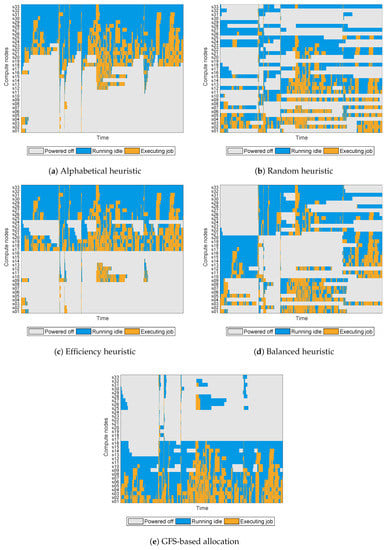 Hitherto, in the proposals of other authors as well as in ours, simple heuristics are used to sort the nodes according to a predetermined metric, such as the power efficiency of the node or the amount of time that has been active (see, for example, References [19,20,21,46]). Nevertheless, relying on simple heuristics derived from expert knowledge inherently limits the eco-efficiency of the node allocation stage, since they are not tailored to the specific underlying hardware of the cluster.