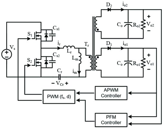 - Park, H.; Kim, M.; Jung, J. Tightly regulated dual-output half-bridge converter using PFM-APWM hybrid control method. In Proceedings of the IEEE Applied Power Electronics Conference and Exposition (APEC), Tampa, FL, USA, 26–30 March 2017; pp. 2022–2026. [Google Scholar]