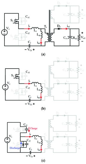 Operation mode of the dual-output LLC resonant converter: (a) Mode 1, (b) Mode 2, (c) Mode 3.