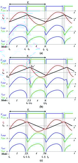 Mode 2 and 5 are parallel resonant modes among the resonant inductance, the magnetizing inductance, and the resonant capacitance. Those modes guarantee soft commutation on the secondary side diode rectifiers. Mode 3 and 6 are the dead time durations of the primary switch. During Mode 3 and 6, the output capacitance of the power switches is charged and discharged to obtain the ZVS. In steady state, the dual-output converter using the hybrid control algorithm can operate under a four operation mode (Case A), a five operation mode (Case B), and a six operation mode (Case C) according to output power conditions.
