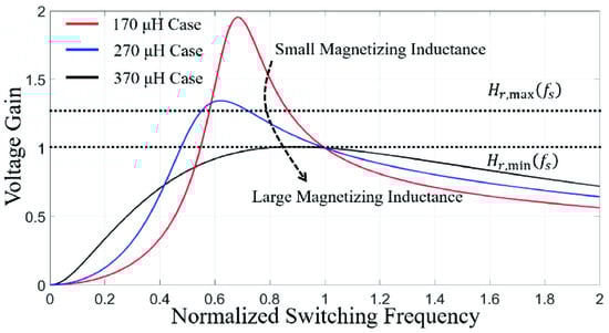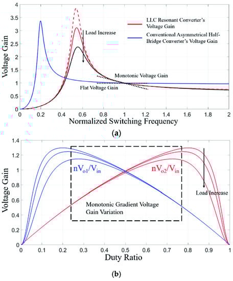 The conventional asymmetric half-bridge converter, only controlled by the APWM, uses small resonant inductance to obtain the linear voltage gain by the APWM []. However, it induces a flat voltage gain by the PFM, which cannot regulate the output voltage with PFM. Therefore, the resonant inductance is high enough to obtain the monotonic voltage gain by the PFM, as shown in Figure 4a. The large resonant inductance has limited monotonic voltage gain by the asymmetric duty variation.