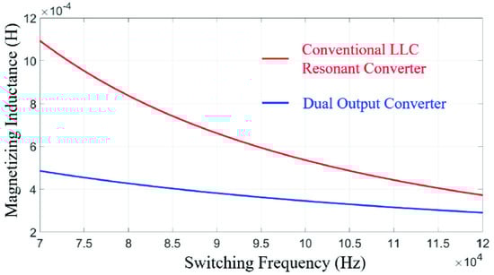 From (11) and (12), the proposed magnetizing inductance and dead time duration can be designed for the dual-output LLC resonant converter to obtain ZVS capability of the primary MOSFETs over the entire load condition. These equations consider both the unbalanced magnetizing current and the switching frequency variation to achieve ZVS. Figure 5 shows the comparison of the required magnetizing inductance between the conventional LLC resonant converter and the dual-output converter to achieve ZVS. The dual-output converter requires lower magnetizing inductance for ZVS capability compared to the conventional LLC resonant converter.