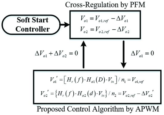 where Vo1″ and Vo2″ are the output voltages of each output channel, which are compensated by the PFM at the next control step. The control iterations of the PFM and the APWM can reduce the output voltage errors of Vo1 and Vo2.