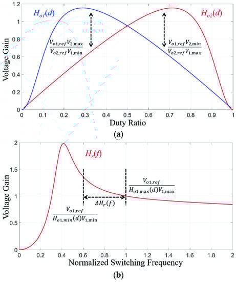 where V1,max and V1,min are minimum and maximum output voltages of Vo1, respectively, V2,max and V2,min are minimum and maximum output voltages of Vo2, respectively. These consider the voltage drop according to the forward bias and conduction loss. Figure 7a shows the maximum voltage gain difference between Ho1(d) and Ho2(d).