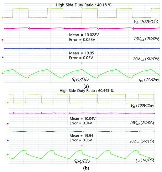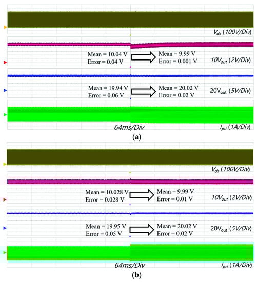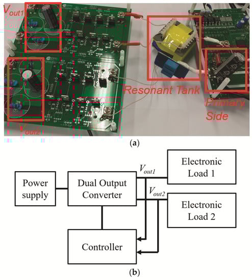 Figure 10 shows the simulation result of the PFM-APWM hybrid control method which has the minimum output voltage error, almost zero, according to the load variation. The simulation results verify the performance enhancement of tightly regulated output voltage of the hybrid control algorithm compared to the conventional cross regulation method. Figure 11 shows the prototype converter and diagram of the experimental setup to verify the performance of the proposed hybrid control algorithm. Figure 11a shows a photograph of the prototype converter which has two outputs and a single primary side. Two separated electronic loads are connected to the converter to verify the output voltage regulation performance as shown in Figure 11b.