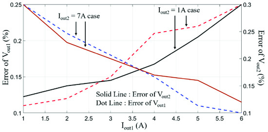 Figure 13 shows the voltage error in cross regulation according to the load variation. In Figure 12, large load difference causes bigger errors of the output voltages. All the detail measured values of the simulation and experimental results are shown in Table 2 which shows the performance comparison of the cross regulation in the output voltages according to the control method. When two output powers are similar, the conventional and hybrid control algorithm has good output voltage regulation performance. When two output powers are significantly different, the conventional control algorithm has poor output voltage regulation. However, the hybrid control algorithm with the proposed design methodology can tightly regulate the output voltage for the entire load difference. The hybrid method shows more than 20 times less voltage regulation errors than those of the conventional simple cross regulation method at the worst condition.