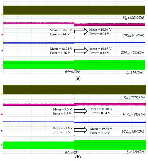 - Kim, J.W.; Ha, J.I. Dual voltage regulation of single switch flyback converter using variable switching frequency. In Proceedings of the IEEE Applied Power Electronics Conference and Exposition (APEC), Long Beach, CA, USA, 20–24 March 2016; pp. 1398–1402. [Google Scholar]