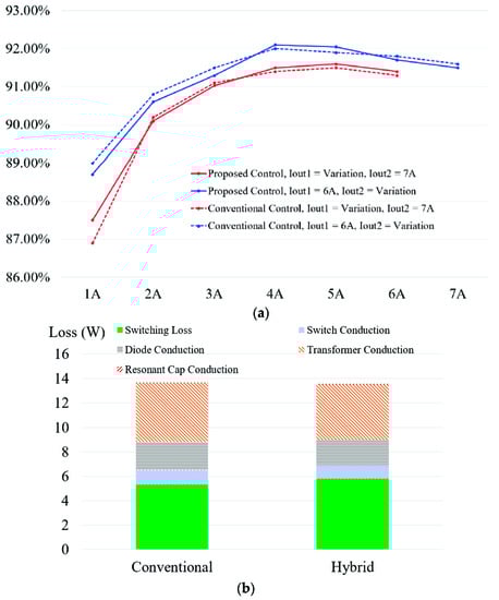 Figure 14 shows the step load response of the prototype dual-output LLC resonant converter using the PFM-APWM hybrid control method which regulates the output voltages under load variations. There are no oscillations and disturbances in the converter operating waveforms. The results indirectly verify operating stability of the dual-output converter controlled by the hybrid control algorithm. Figure 15 shows the step load response of the conventional cross regulation method. The conventional regulation method has poor output voltage regulation according to the load condition. At the worst condition, the output voltage regulation performance is 24 times poorer compared with the hybrid control algorithm. The poor output voltage regulation is shown in Table 2. Figure 16 shows the power conversion efficiency of the prototype converter according to the load variations which show the load change in one output channel when the other is set to a fixed value. The proposed algorithm reduces the offset current on the magnetizing inductance compared with the case of the conventional method. However, the APWM operation induces a higher turn-off loss than that of the conventional method. Figure 16b shows the loss analysis according to the control method. Figure 16a shows the power conversion efficiency between the conventional and proposed methods. The power conversion efficiency is similar between the two control methods.
