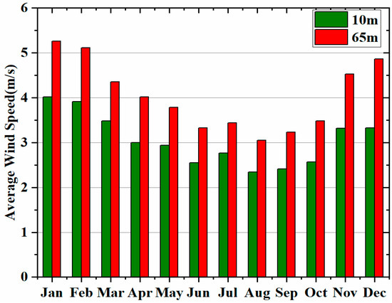 There were two important observation devices namely Doppler Sodar (MFAS64, SAMEER, Mumbai, Maharashtra, India), which is operated using a multi-frequency around (1600–2500 Hz) and the other was the UHF (ultra-high frequency) Wind Profiler (1280 MHz, PEC India, New Delhi, New Delhi, India). The measured hourly data was averaged monthly for the 10 m and 65 m height and shown in Figure 1. From Figure 1, it can be clearly observed that the maximum average wind speed available in the month of January was 4 m/s at 10 m and 5.2 m/s at 65 m. Similarly, the lowest average wind speed was present in the month of August and was 2.5 m/s at 10 m and 3 m/s at 65 m. The wind pattern slowly reduced from January and again reached to a maximum in the month of December.