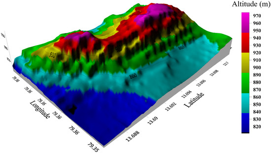 The total number of data samples collected was 52,609 and from these 310 missing data were present and the remaining data were taken into consideration for the analysis. The surface plot for the selected site is shown in Figure 2 and these were obtained using ArcGIS software. From Figure 2 it can be stated that, the highest altitude was nearly 960 m from the sea level and the violet color shows an altitude of 960 m.