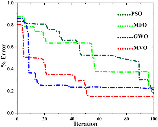 As shown in Table 1, MVO was compared with other numerical methods and a meta-heuristic technique for estimating the Weibull parameter and its r and RMSE were obtained. Among these methods the energy pattern method had the least k value of 1.5142 and its c value as 5.305. Other numerical methods generated different k values that does not fit the real wind pattern and the error was also more. When the RMSE value is low, then we can say that the real wind pattern fits the Weibull density function respective to the k and c values. In Table 1, after performing a statistical analysis it was found that MVO had the least error of about 0.0052 and it was less than 1%. The correlation value r was reaching to 100%, i.e., 0.995 for the study case. These values obtained from the proposed method were better than other numerical methods and meta-heuristic techniques. On comparing the GWO, PSO, MFO and MVO it was evident that MVO was performing better than other methods. The convergence curve was provided for the proposed method in comparison with the other method, it showed that MVO converged with less % error and in the minimum number of iterations as shown in Figure 3.