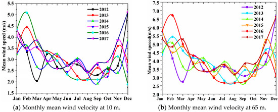Monthly mean wind speed for 10 m and 65 m from 2012 to 2017.