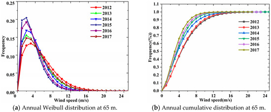 Annual (a) Weibull and (b) cumulative distribution from 2012 to 2017 at 65 m hub height.