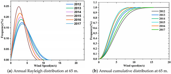 Annual (a) Rayleigh and (b) cumulative distribution from 2012 to 2017 at 65 m hub height.