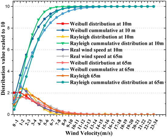 Weibull and Rayleigh frequency distribution compared with real data at 10 m and 65 m.