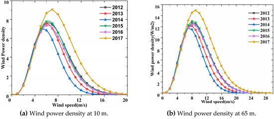 Wind power density at (a) 10 m and (b) 65 m from 2012 to 2017.