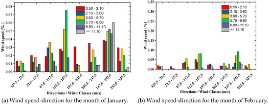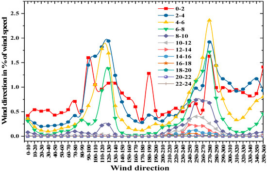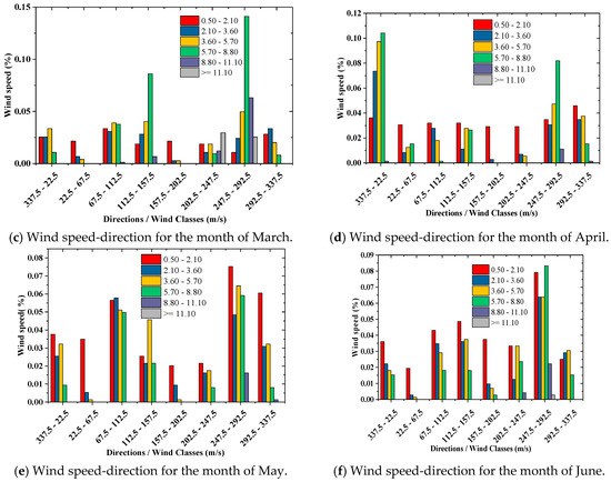 The overall wind speed and wind directions are presented in Table 5 in the form of bin-sector and its distributions is shown in Figure 9. After analyzing Table 5 it is clear that the wind direction was most dominant between the sector 270–280° and 120–130°, having a frequency of 8.77% and 6.34%. It also suggested that the wind speed ranged from 2 m/s to 10 m/s in the above-mentioned sector directions. Whereas low wind speed flowed in the sector 170–180° from 0–4 m/s. Wind direction study showed that majority of the wind was flowing in the sector 260–280° that corresponded to SSW and NNW. The wind speed and direction graph for the months from January to June is shown in Figure 10.