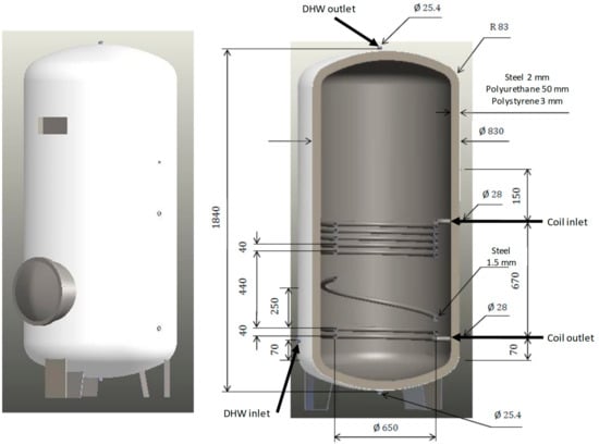 The setup examined in this study is a buffer tank that provides DHW. The analysis is performed in steady and transient operating modes. The volume of the tank is approximately 1000 L. The inlet for the cold-water supply is side-mounted to the bottom of the tank, and the DHW exits from the top central section of the tank, which takes advantage of the natural convection of hot water that tends to flow up due to the temperature increase. The inlet of the hot water from the boiler is located at the middle of the tank on the side opposite to the cold-water supply inlet, and the outlet of the water that returns to the boiler is also on the opposite side of the cold-water inlet and at the same height. Therefore, the heat exchange has countercurrent water flows. Figure 1 shows two images of the tank, where one is an outside view, and the other is a cross-section with functional dimensions.