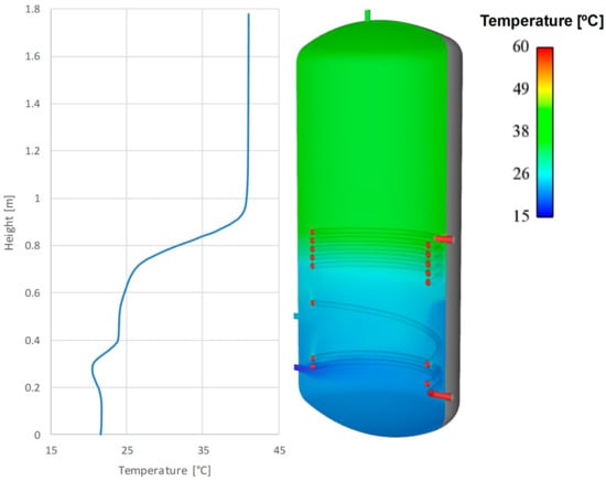 The heat exchanged between the water circuits can be visualized with the temperature field inside the entire tank and the temperature distribution. Figure 2 shows the temperature field in the center plane of the tank, and the graph shows the temperature at the centerline. There is noticeable stratification in the central area, where the temperature in the upper zone is greater than 40 °C, and in the lower zone, the stratification is close to that of the inlet supply water. The heat transfer is predominantly convective for the studied tank. On one hand, heat transfer calculations show that radiation is only 1–1.5% of the total heat transferred from the heat coil due to the high convective coefficients of water and the low temperatures (maximum 90 °C) of the system. On the other hand, conduction along the tank walls is virtually zero.
