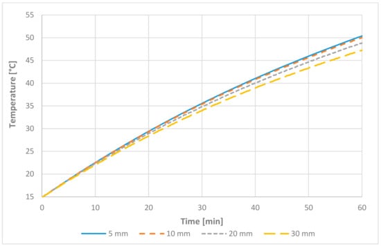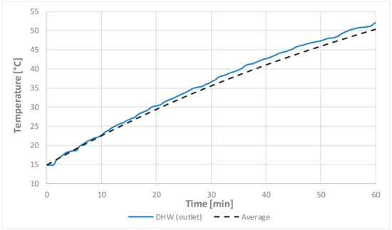 The temperature evolution inside the tank is shown in Figure 4. The picture shows that the tank needs nearly an hour to reach a temperature of 50 °C. In Figure 5, the evolution of the temperatures in the outlet (DHW) and the average of the whole tank are compared. The DHW is slightly higher than the average, which means that the whole tank heats evenly and there is little stratification, as shown in Figure 4. This lack of stratification delays the availability of a desirable DHW temperature.