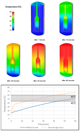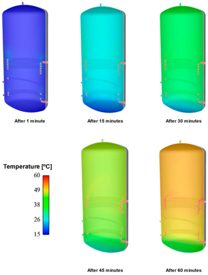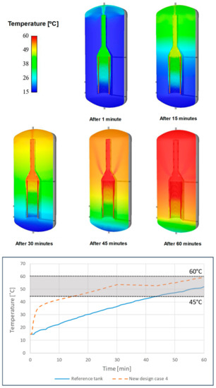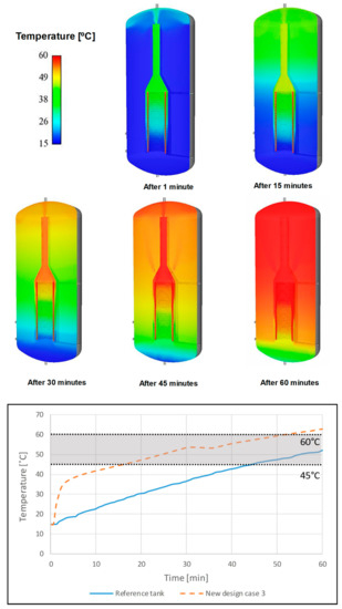 In this transient state case only, the top outlet is open during the first half hour, and during the subsequent half hour, it is closed; then, the four holes of the conical section are opened. The goal here is to achieve the 45 °C set point at the DHW outlet rapidly by opening the top outlet at the start of operation while maintaining a temperature within the 45–60 °C range in that section but without exceeding 60 °C. After the outlet is closed, the holes of the conical section are opened after 30 min of operation. Thus, the heating of the tank continues with the internal thermosyphon system; however, water is released to the lower level in the tank to prevent an excessive increase in the DHW temperature. Figure 10 shows the temperature fields inside the tank and the evolution over time. A large temperature stratification is observed in the internal thermosyphon system, which is also transmitted to the rest of the accumulated water. In addition, the 38 to 42 °C temperature front moves forward as a higher temperature in the tank is reached. In the first minute, an elevated temperature is already reached at the DHW outlet area, and the 45 °C set point temperature is achieved after approximately 15 min. Just as in cases 1 and 3, the time required to reach the 45 °C set point is 15 min. In this case, the outlet DHW temperature stabilizes at approximately 53 °C after 30 to 44 min. The temperature remains within the 45–60 °C range until heating is finished and does not go above 60 °C, which prevents user burns. This is the best case to meet the requirements because it provides a rapid response to a sudden DHW demand and stays within the temperature range specified to meet the operational safety requirements.