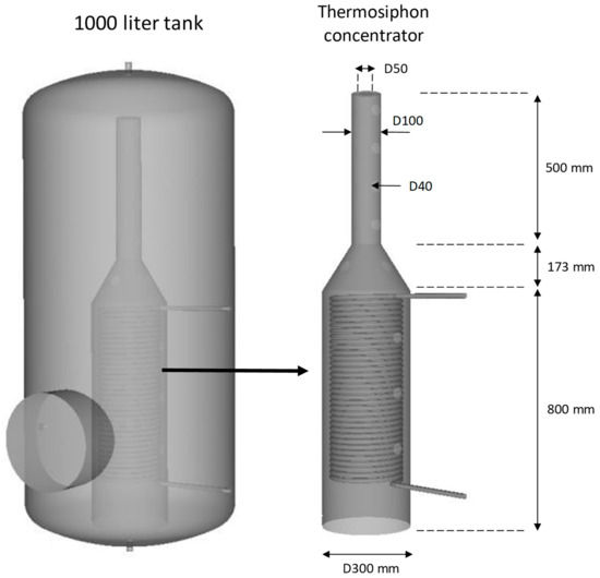 The authors’ previous paper [18] also proposed a new design to improve the thermal stratification of the buffer tank. In that case, an external devise was used to inject the hot water in the highest zone of the tank. In the present paper, a simpler and more efficient design is sought. To achieve the outlined objectives, it was decided to install a funnel-shaped tube inside the tank that encloses the heating coil and guides the hot water to the top section for greater temperature stratification and to ensure any sudden hot water demands can be met because the thermosyphon effect will be concentrated. The shape of the tube, which has a conical section in the middle that reduces the cross-section by two-thirds, seeks to improve the chimney or vacuum effect to make water flow upward more rapidly. In addition, there are several holes in the wall of the conical section of the tube, which can be opened or closed depending on the case, to mix the water that circulates inside with the rest of the accumulated water when their temperatures are similar following the natural thermosyphon mechanism. Figure 6 shows the geometry of the new design and the details of the tube that concentrates the thermosyphon effect.