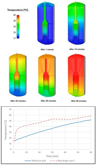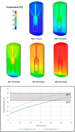 In this operation case, the sequence to open the holes in simulation 4 is used, and the impact of extending the internal tube to achieve a higher temperature at the bottom of the tank is analyzed. Therefore, the top outlet is open during the first half hour and then closed, and the four holes of the conical section are then opened with the extension of the thermosyphon tube. Figure 11 shows the evolution of the outlet DHW temperatures and the temperature fields inside the tank. The internal tube area in contact with the wall extension initially creates an area of lower temperature due to the cold water entering from outside the tube, which has not been heated by the coil. However, as time progresses, the effect is that the lower area of the tank reaches a temperature of approximately 38 °C after 45 min of operation. Therefore, a higher temperature at the bottom of the tank is achieved to obtain a greater uniformity of temperatures in the coil area. Thus, heat transmission is more efficient.