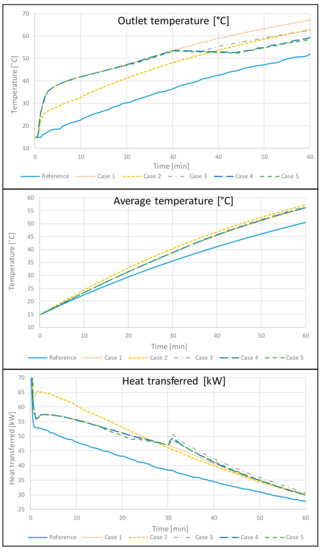 Figure 12 shows a comparison of the outlet DHW temperatures, average temperatures and heat transfer after analyzing the different graphs and profiles of the operation cases of the redesigned tank; the cases that more effectively meet the optimal objectives are cases 4 and 5. Regarding the average temperatures, the redesign improved the average temperature of the tank in all cases with no significant differences, which indicates a heat transfer improvement due to the concentrated thermosyphon effect. Although, in case 5, the achieved outlet DHW temperature and the heat exchanged are slightly lower in comparison with those of case 4, it is confirmed that the extension of the internal thermosyphon tube enables the accumulation of hotter water in the bottom of the tank. It is therefore important to consider both cases in a stationary state due to the similarity of results. The heat transfer graph shows a clear improvement of the redesign effectiveness, which is higher than the reference case for all scenarios, especially for the “case 2” (tube perforations opened). This shows that the thermosyphon effect is the main mechanism in the heat transfer increase, since the “case 2” produces a higher buoyancy flow. This scenario (case 2) is the most efficient in an energy analysis, however, regarding the DHW heating times, other cases with a higher stratification degree produce better results. Therefore, both effects, the thermosyphon effect and stratification degree, should be considered by manufacturers for the buffer tanks design specifications.