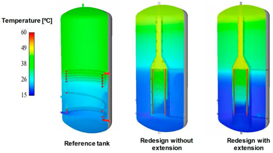 After analyzing the operation of the redesigned tank during a stationary heating test, the operation during the consumption of DHW is analyzed; therefore, a simulation in the stationary state is performed. Two cases of the redesigned tank are studied, i.e., with and without extension of the inner tube. In both cases, only the top outlet remains open. Figure 13 shows the temperature fields inside the reference tank and of the tanks with the internal thermosyphon tube. In both redesigns, the temperature of the water accumulated in the upper section is higher than that in the tank with the initial geometry in stationary mode. In addition, there is a considerably higher temperature stratification, which benefits the heat exchange; this is because the thermosyphon effect increases the speed of the fluid flowing up, and thus, the convective heat transfer is greater. The stratification is slightly more defined in the case of the redesign with the tube extension because it collects water from the bottom of the tank, which is the coldest point. Table 4 presents the numerical values of the outlet DHW temperature, which is higher in the redesign cases. The improvement in the heat exchange mentioned above can also be observed.