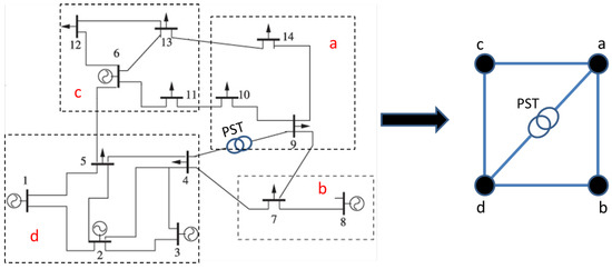 As illustrated in Figure 1, the Matpower’s 14 bus test case [17] was modified to accommodate a PST between the buses 4 and 9. The original system buses were manually aggregated into four clusters and a static PTDF matrix was calculated to represent the power flows between them. The newly reduced system is composed of four buses connected by five branches, where the PST was installed in the branch connecting buses a and d. To assess the results, the five branches of the aggregated model were compared with the expected exchanges of the original system. For simplification purposes in notation, those aggregated exchanges were considered as five branches of the original system.