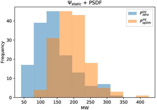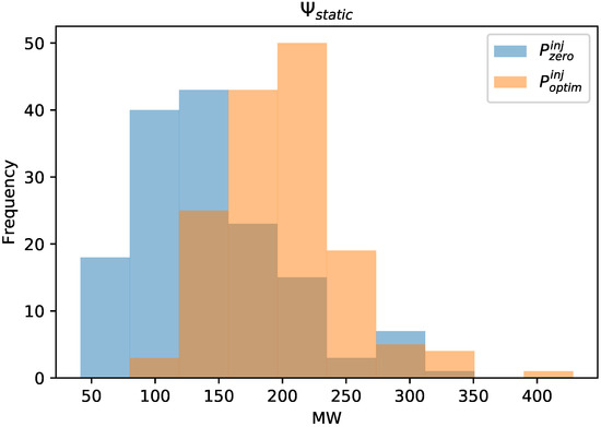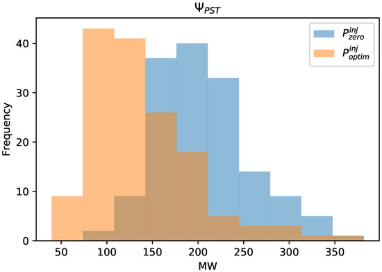 The results in Table 6 show that the static PTDF matrix representation performed well under the scenarios from which it was built. When the “non PST optimized” injected powers () were applied to the “PST optimized” PTDF matrix (), the results are less accurate than when applied to the “non PST optimized” PTDF matrix () representation and vice versa.