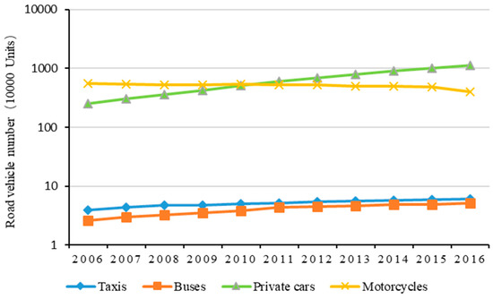 - Wang, H.; Fu, L.; Yu, Z.; Xuan, D.; Ge, W. Trends in vehicular emissions in china’s mega cities from 1995 to 2005. Environ. Pollut. 2010, 158, 394–400. [Google Scholar] [CrossRef]