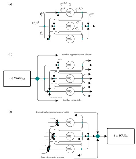 Schematic of the proposed source and sink hyperstructures based on HEN hyperstructure [31] (dashed arrows indicate flows among hyperstructures of the same source or the same sink similar to the definition of and ). (a) HEN hyperstructure; (b) Source hyperstructure for HIWAN; (c) Sink hyperstructure for HIWAN.
