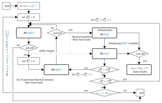 - An important assumption in the proposed hyperstructure is the value of Heat Recovery Approach Temperature (HRAT) for which problem P1 and problem P2 are solved. This value affects the targeting values of thermal utilities as well as the set of potential thermal streams and their matches; therefore, the model is solved iteratively for several HRATs. The NLP hyperstructure is then solved for Heat Exchanger Minimum Approach Temperature (ΔTmin) values equal to HRAT.