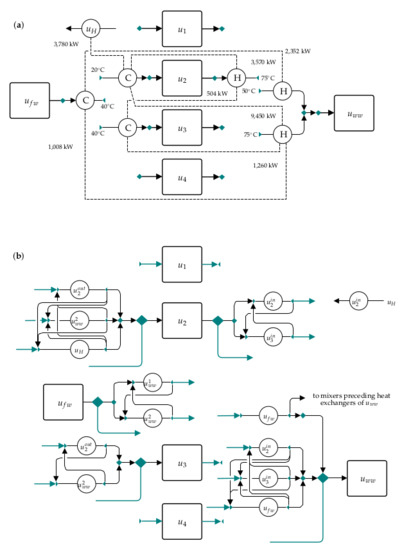 The mass and energy balances of non-water thermal streams follow the same constraints of the HEN synthesis problem of Floudas and Ciric [31] (Figure 1a introduces the full set of related variables and parameters):