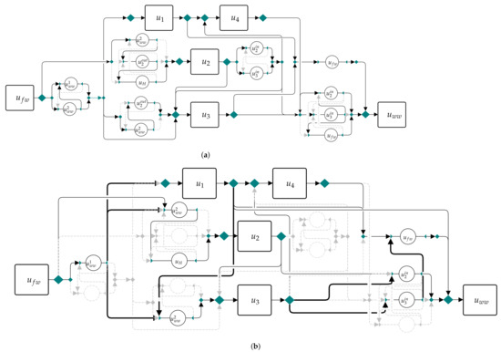 - Bypass streams are added between different superstructures associated to one source or one sink (shown as dashed arrows in Figure 1b,c). This mimics in the HEN hyperstructure (Figure 1a), which characterizes the flow from the splitter following the match between k and to the mixer preceding the match between k and l within the superstructure of stream k.