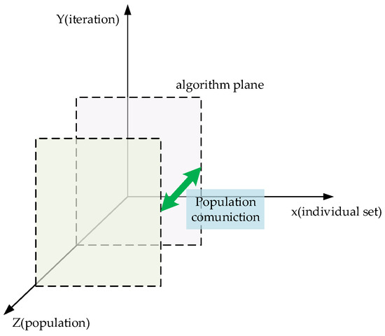Any population-based intelligent optimization algorithm requires a population with multiple individuals. The algorithm needs to perform iteration in the search process. The individual of the population evolves according to the algorithm mechanism in each iteration. Some algorithms simulate complex multi-population model, and multiple populations coexist and communicate by specific communication mechanisms. Therefore, a population-based intelligent optimization algorithm can be considered as a three-dimensional model, as shown in Figure 1. We consider the population-based optimization algorithm to be a three dimensional structure: x-dimension, y-dimension, and z-dimension; where x represents the individual dimension of the population, y represents the iterative dimension of the loop, and z represents the parallel population dimension. The x-y forms an algorithm plane that can search independently. Multiple algorithm planes are parallel on the z-dimension and influence each other by exchange individuals. A simple algorithm degenerates to a point in the z-dimension, meaning a single population, and has the same behavior in both the x- and y-dimensions, representing that the algorithm has only one behavior. Current algorithm research tends to improve algorithm performance and robustness through a combination of multiple behaviors. From the three-dimensional model, it can be seen that each dimension can be combined with different behaviors, and a combination of behaviors in different dimensions contains a different optimization idea that should bring different effects. This article divides the multi-behavior combination into three levels: