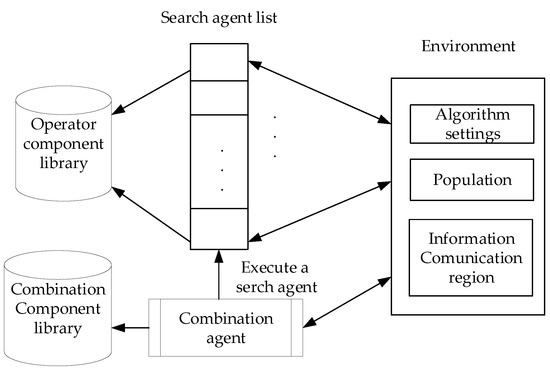 First, an operator component library is built for the operators that represent various candidate behaviors. The core of the framework is to construct the search agent which represents a behavior in runtime. Multiple behavior set are expressed by a search agent list. Therefore, operators that implement a behavior are encapsulated in a search agent. Each search agent is autonomous and can perform the search in a centralized or distributed environment independently. The combination of algorithms or combination of operator components is transformed into a combination of search agents. Multi-behavior combination is modeled by a combination agent which describes the combination scheme and determines the execution logic in order to schedule the search agents. The combination component library includes some related combination modes and strategies. A multi-agent system environment is defined for information exchange among search agents, including the entire population information, general settings of algorithm, information communication region. The framework structure is shown in Figure 2.