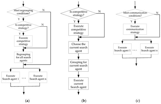The combination agent includes the data structure for describing the combination scheme and the algorithm for executing the combination mechanism. Each search agent represents a specific behavior. The combination scheme defines the combination mode and combination strategy for multiple behaviors (multiple search agents). In the framework, we predefined three basic combination modes as {individual level combination, iteration level combination, population level combination}. Each combination mode needs to define its population grouping strategy and execution strategy, which determines the individual group and execution manner for all search agents in a combination mode. The predefined strategies are shown in the Table 2 and are supported by the combination component library which includes the three combination mode components, grouping components, competitive strategy components, group communication components. The flow chart of three combination mode components in one iteration is shown in Figure 3. It can be seen that the other strategy components are called by the combination mode components. The combination agent executes corresponding combination mode components according to the combination scheme described.